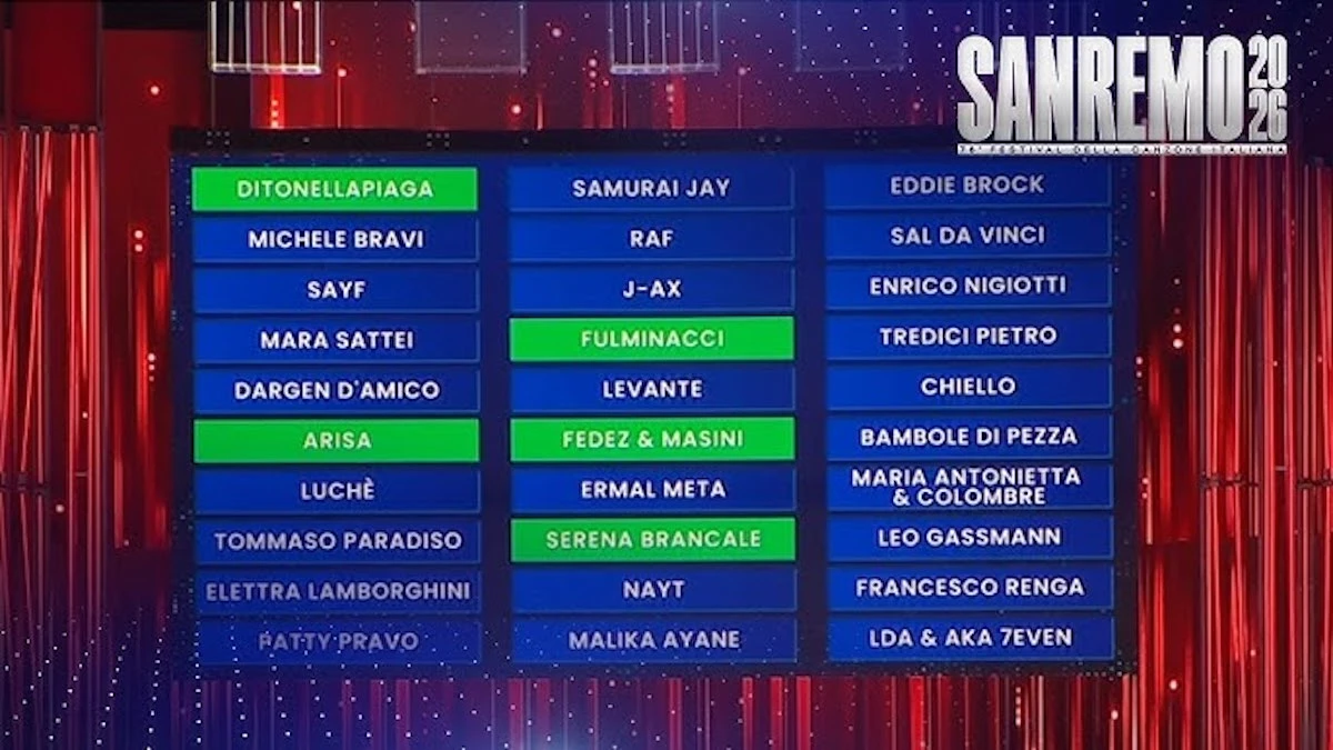 La prima serata del Festival di Sanremo 2026 si è chiusa con la tradizionale lettura della Top 5 provvisoria votata dalla Giuria Sala Stampa, TV e Web. Carlo Conti ha annunciato i cinque nomi in ordine casuale (senza posizioni): Arisa, Fulminacci, Serena Brancale, Ditonellapiaga, Fedez & Marco Masini.